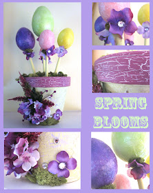 5. Hot glue moss to the top of the Styrofoam ball and to the base of the eggs. Glue flowers and gems to the front of the clay pot and to the base of the eggs.